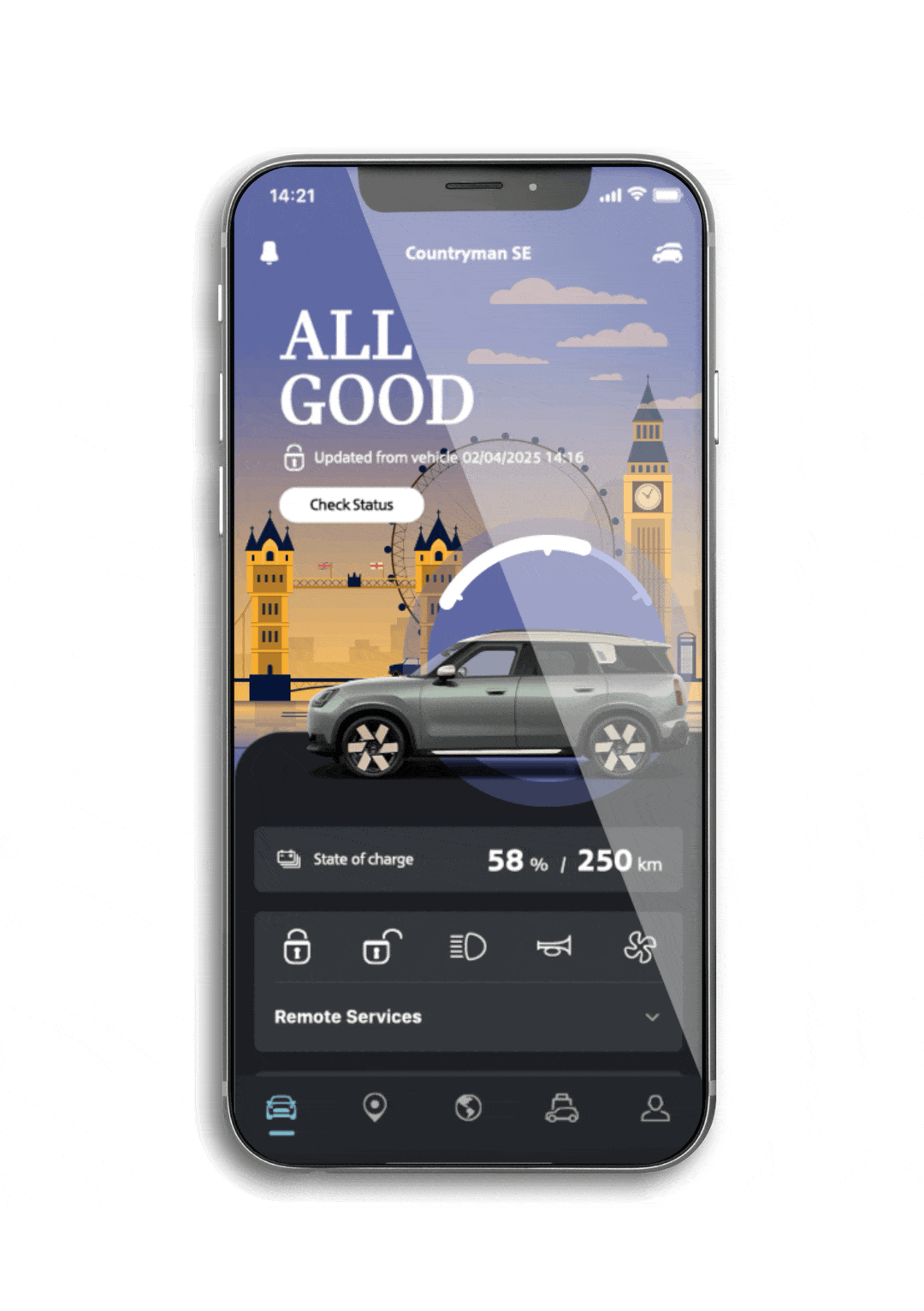 - Fáðu aðgang að ítarlegum upplýsingum um MINI þinn, þar á meðal núverandi stöðu bílsins og viðhaldsþarfir.
